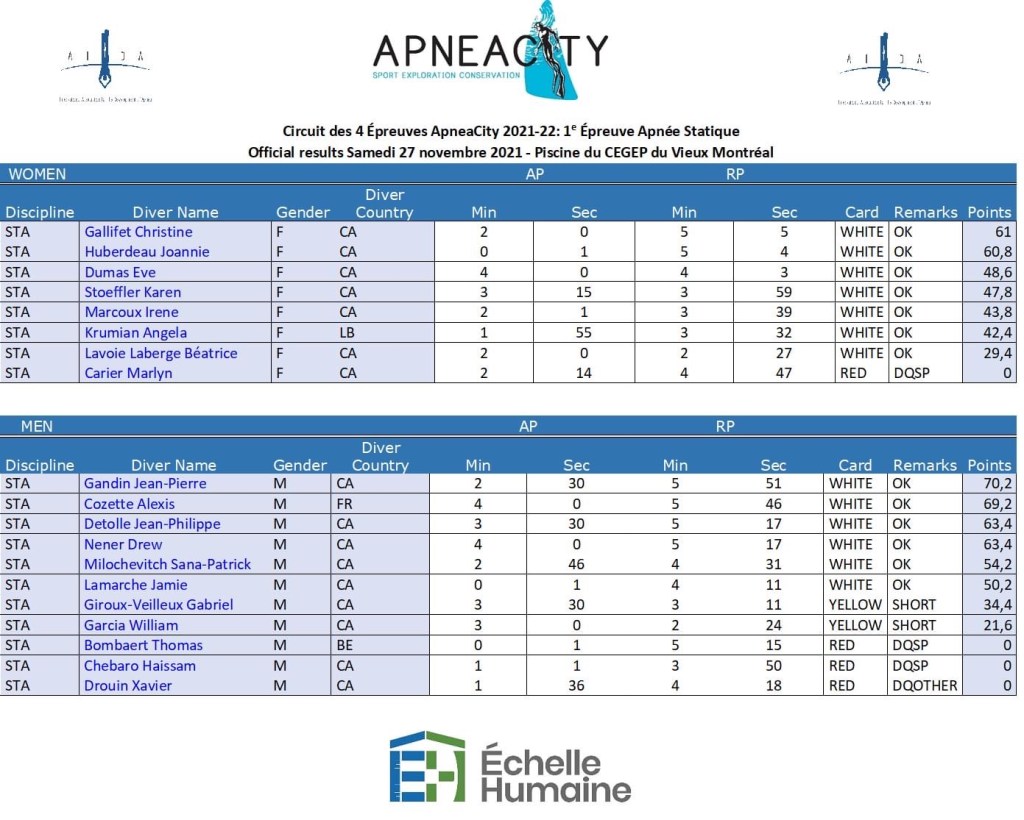 Lors de la première épreuve du circuit de compétition Apnéacity AIDA à Montréal, Christine Galifet s’impose en apnée statique avec une apnée à 5 min 05.